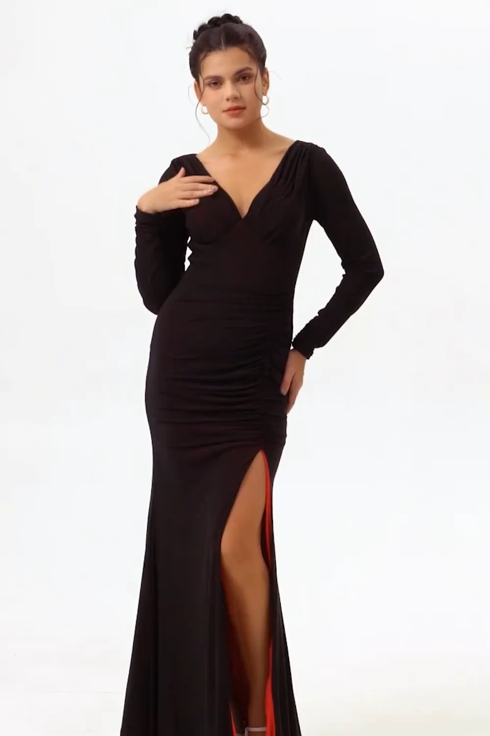 Black Red Long Sleeves V-Neck Wedding Guest Dress with Slit