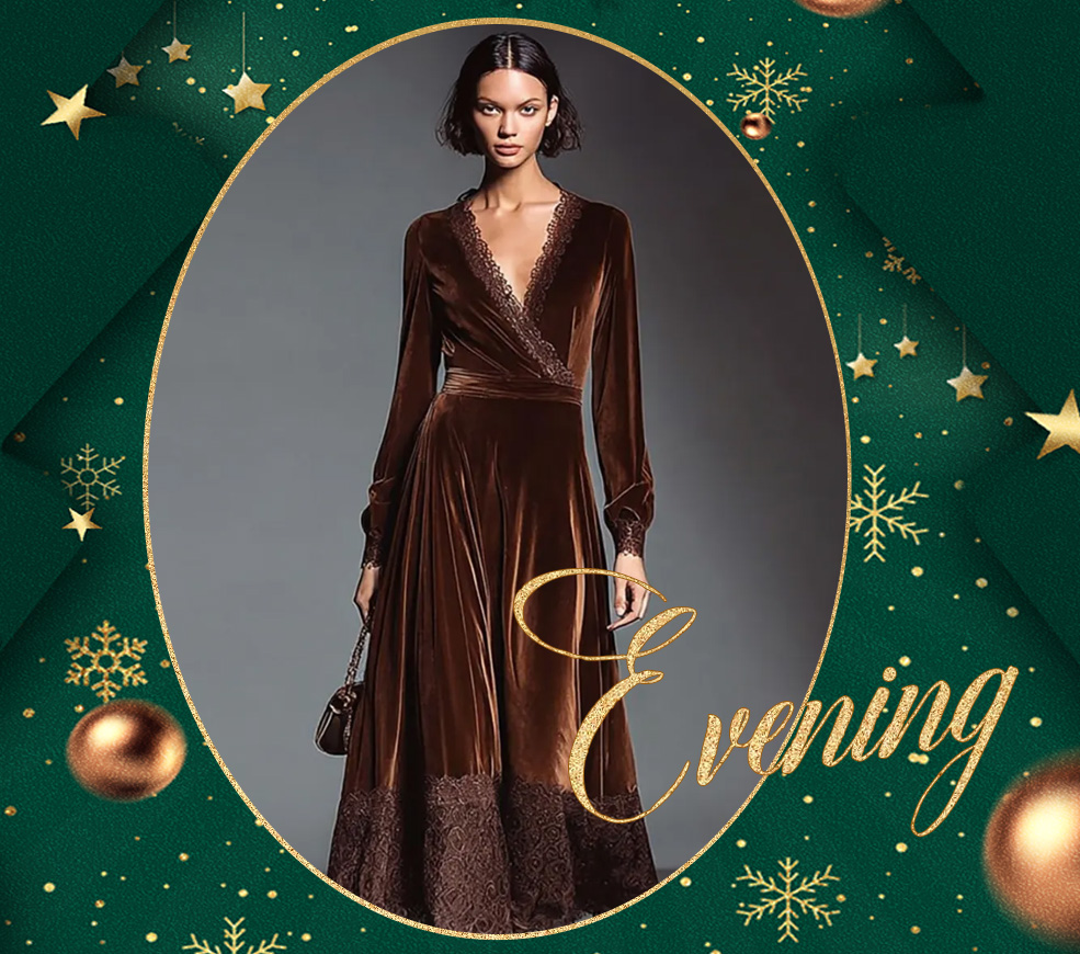 Elegant Caramel Velvet Ruched V Neck Long Holiday Party Dress with Sleeves
