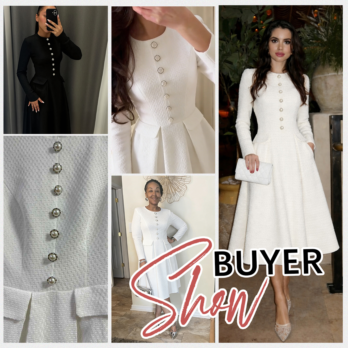 This ivory tweed inspired coat dress showcases a timeless A-line silhouette that flatters the figure with effortless grace. Designed with a round neckline, long sleeves, and a single-breasted front adorned with statement gold-tone buttons, it balances classic tailoring with modern refinement. The fitted bodice transitions into a softly flared midi skirt with pleat accents, while side pockets add subtle practicality.