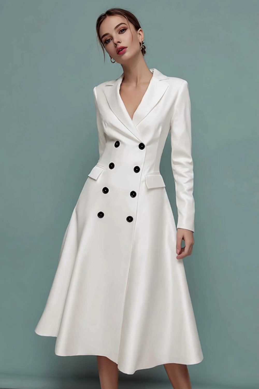 Ivory Notched Lapel Double Breasted Midi Blazer Dress with Sleeves