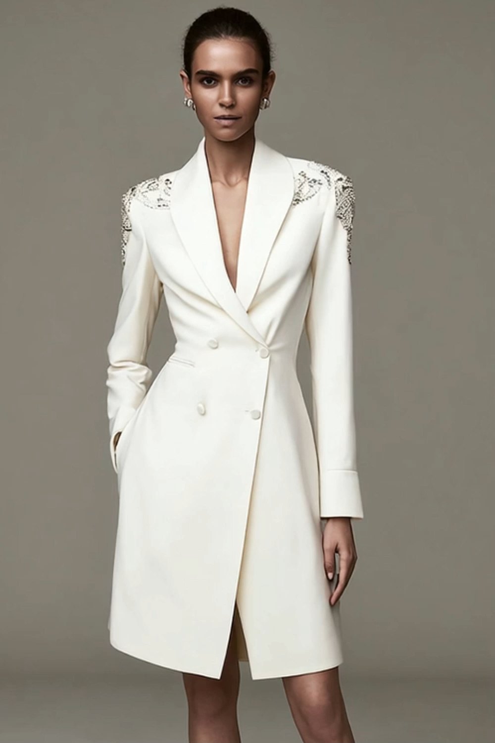 Ivory Pencil Satin Shawl Lapel Short Dress with Beading