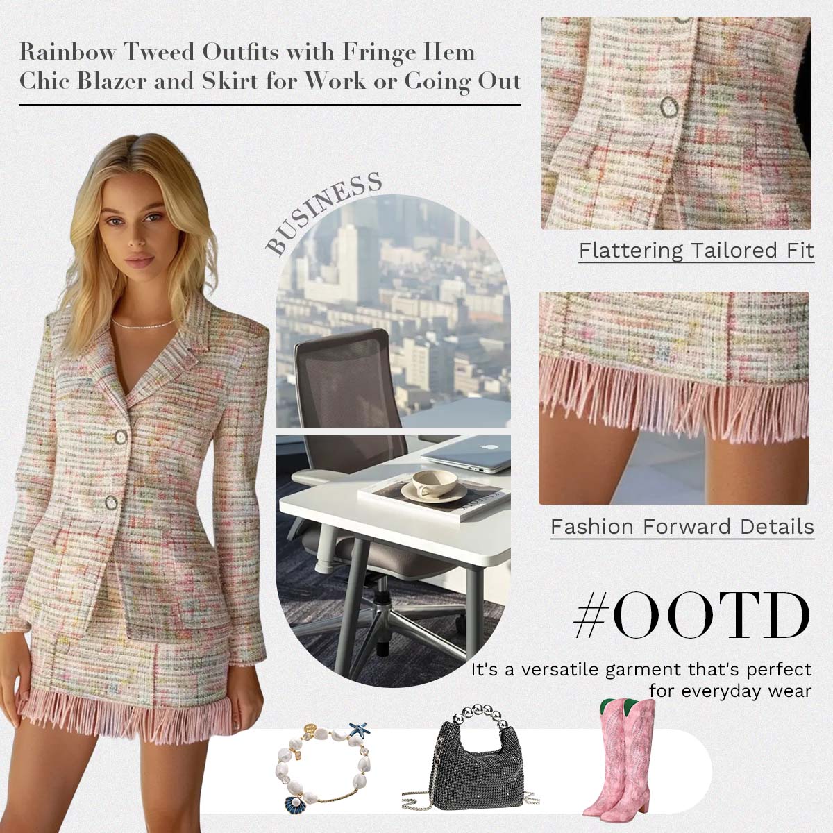 This chic two piece tweed set features a tailored blazer with structured shoulders, a notched lapel, and a double button closure for a sophisticated silhouette. The matching mini skirt is finished with playful fringe trim, blending elegance with a modern, youthful charm. The pastel tweed fabric with subtle multi-color threads adds texture and depth, making this outfit stylish yet refined.