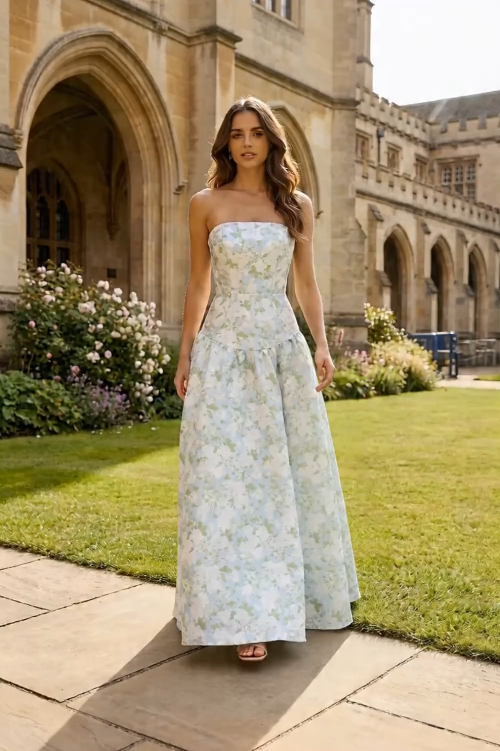 Blue and White Floral A Line Strapless Long Wedding Guest Dress