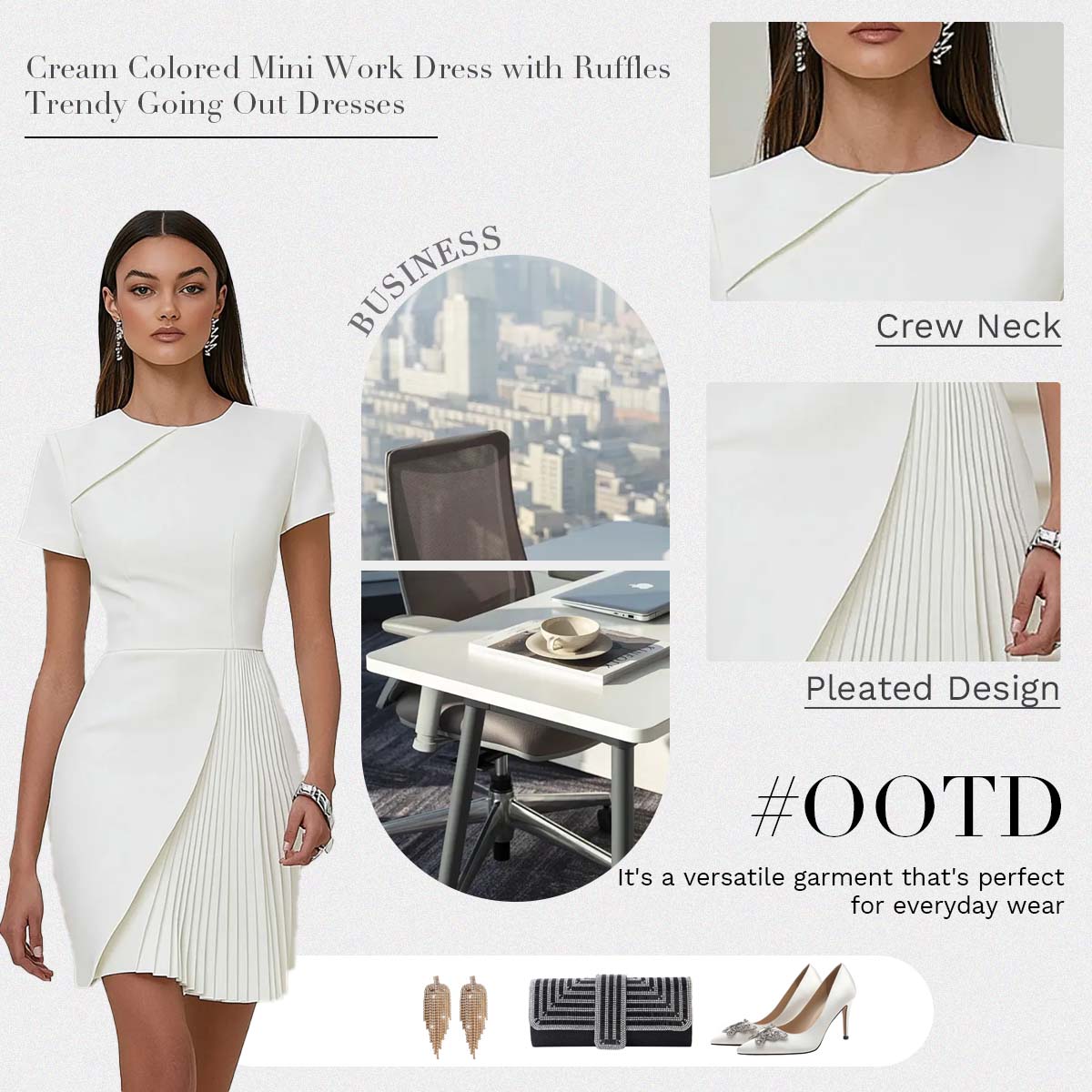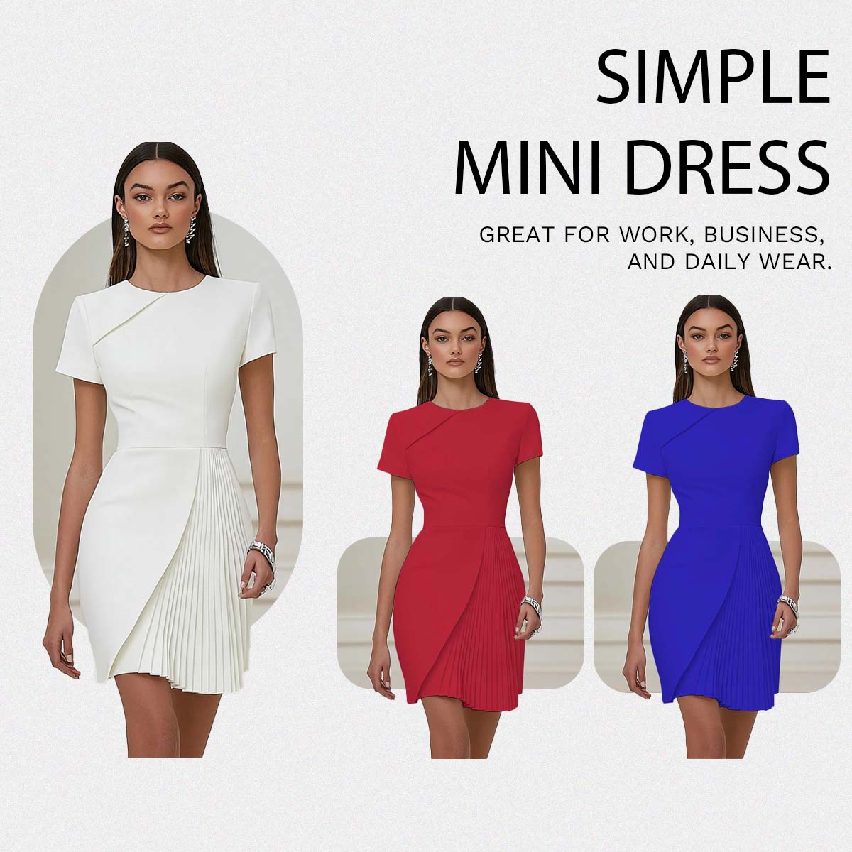 Featured: This refined white work dress blends classic professionalism with modern femininity. Designed in a flattering bodycon silhouette, it features a high waist and delicate pleats that enhance your shape while offering all day comfort. The crew neckline and short sleeves provide a clean, polished look that’s perfect for warmer days in the office. Made from premium fabric with a smooth finish and slight stretch, this dress is both stylish and functional — ideal for work, business meetings, and professional settings where a confident, elegant presence is essential.